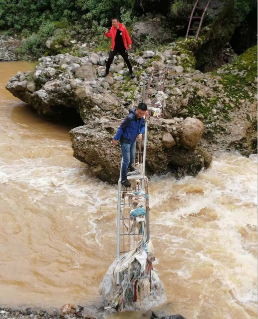 前進路上地勢極其復(fù)雜多變,崎嶇的山路,茂密的叢林,山嶺重疊交錯,蜿蜒盤旋,猶如一條正在酣睡的巨龍,腳下松軟的泥土像擁有靈魂的沼澤,不斷拖慢隊伍前行的速度。湍急的河流不斷奔涌,只有一個簡陋的橫梯橫在中央,但是,如此復(fù)雜的路徑最終還是被隊伍赤誠的責任心和兄弟間互幫互助的團結(jié)情所擊退。