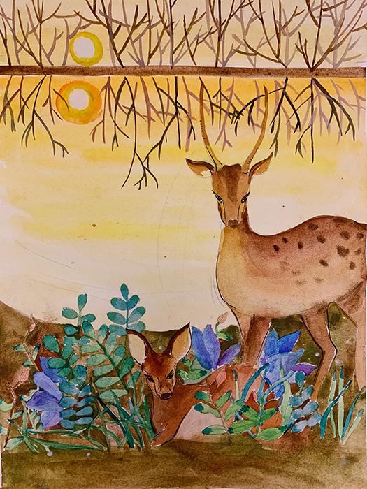 寓意:此畫(huà)旨在倡導(dǎo)人與自然和諧發(fā)展、和諧共生、保護(hù)動(dòng)物、保護(hù)生物多樣性。小作者用自己手中的畫(huà)筆將心中對(duì)小鹿的喜愛(ài),對(duì)動(dòng)物生命的崇敬,描繪了夕陽(yáng)下綠草叢蔭中兩只麋鹿安詳?shù)臈⒌氐奈喇?huà)面。通過(guò)鹿的棲息地體會(huì)到小作者內(nèi)心的溫暖,用畫(huà)作來(lái)感悟生命,以藝術(shù)呵護(hù)生命,以真情來(lái)倡議大家保護(hù)動(dòng)物,參與到生命共同體的保護(hù)行列中。
