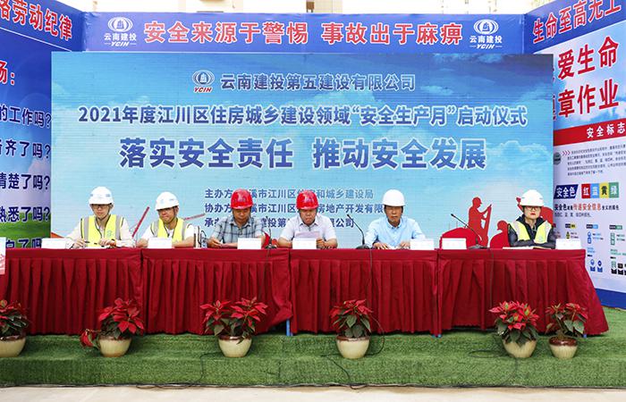 6月15日, 由玉溪市江川區(qū)住房和城鄉(xiāng)建設(shè)局主辦、玉溪市江川區(qū)興民房地產(chǎn)開發(fā)有限公司協(xié)辦,云南建投第五建設(shè)有限公司五〇一直管部承辦的江川區(qū)住房城鄉(xiāng)建設(shè)領(lǐng)域“安全生產(chǎn)月”啟動(dòng)儀式在書香苑二期項(xiàng)目舉行。玉溪市江川區(qū)住建局局長(zhǎng)李竹貴、玉溪市江川區(qū)興民房地產(chǎn)開發(fā)有限公司經(jīng)理張文祥出席本次活動(dòng)。參加本次活動(dòng)的還有江川區(qū)住建局、質(zhì)安站等單位,以及江川區(qū)同行業(yè)企業(yè)的代表共計(jì)100人。