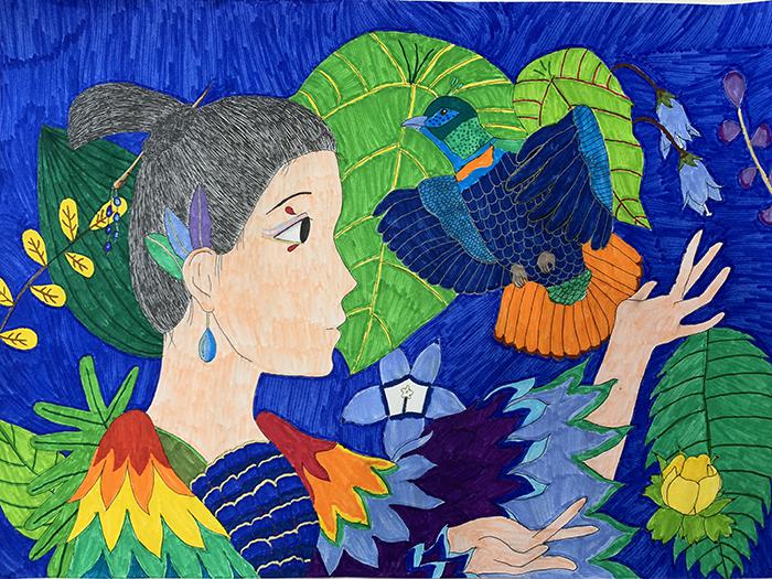畫中描繪了色彩絢麗的棕尾虹雉,頭部為綠色,藍(lán)綠色羽冠,上體紫藍(lán)綠色,羽干細(xì)而裸出,羽端呈匙狀,如同絲絨一般,全身羽毛都閃耀著彩虹一樣的金屬光澤,又叫“彩虹鳥”和“九色鳥”。將絢麗多彩的“彩虹鳥”在心中、畫中擬人化,展開豐富的想象,以人物的形象將鳥擬人成人物,又將美麗的少女形象地比擬成“彩虹鳥”。她們低聲細(xì)語,輕聲呢喃。將心中對(duì)生命的愛,對(duì)動(dòng)物、植物、綠色、美麗的家園、美好的愿景展示出來。反映了人與動(dòng)物,人與自然,和諧共生,和諧共處,你中有我,我中有你,你就是我,我就是你。形成一幅絢麗多彩的畫面。展現(xiàn)出小作者對(duì)美好事物的憧憬,內(nèi)心的純凈與美好,體會(huì)到小作者內(nèi)心的溫暖與美好。