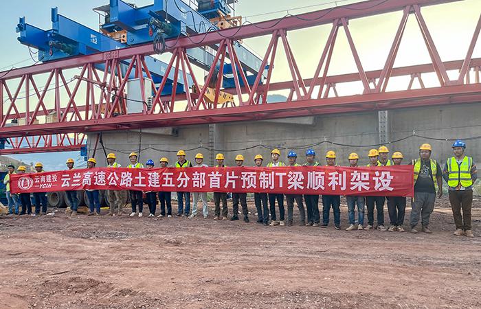 5月31日晚7點(diǎn),經(jīng)過三個(gè)小時(shí)的吊裝工作,由路橋五部負(fù)責(zé)施工的云蘭高速土建五分部龍?zhí)洞髽蛴曳谑?/span>完成首件T梁架設(shè)。