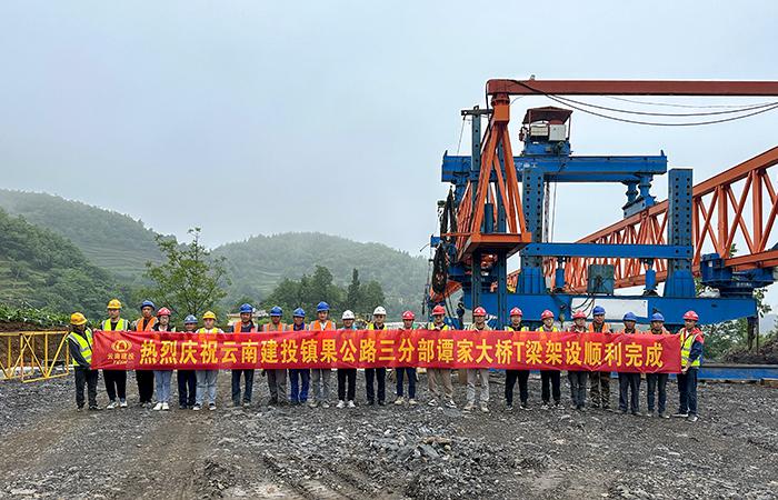 譚家大橋長642米,左右幅均為16跨,為確保此標段梁板順利架設完成,項目部班子成員及標段工長多次召開會議進行詳細研討和安排,從施工組織方案、施工安全管控、到橋架機過孔、T梁間防墜護安裝施工及鎮(zhèn)雄惡劣天氣應對等環(huán)節(jié),進行科學論證以確保工程的順利推進。在此標段中,T梁架設是攻堅關鍵點之一,此次T梁的順利架設完成,為橋面施工提供了作業(yè)面,也為下個節(jié)點目標實現(xiàn)提供了堅實保障,為2024年6月底實現(xiàn)主線通車目標奠定了堅實基礎。