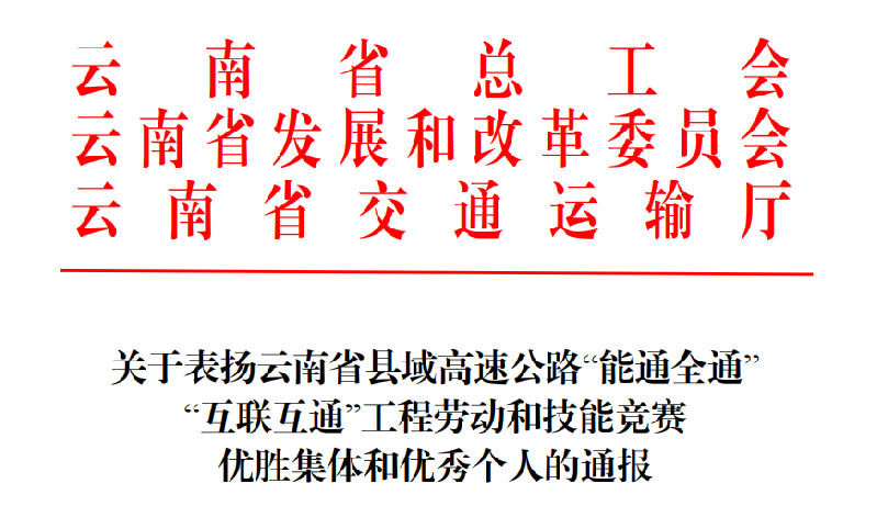 近日,云南省總工會、云南省發(fā)展和改革委員會、云南省交通運(yùn)輸廳聯(lián)合下發(fā)通報(bào),公布了云南省縣域高速公路“能通全通”“互聯(lián)互通”工程勞動和技能競賽中優(yōu)勝集體、優(yōu)秀個(gè)人獲獎(jiǎng)名單。其中,公司路橋五部黨支部書記楊澤軍、賓鶴高速土建八工區(qū)項(xiàng)目經(jīng)理馬海周兩名干部職工獲評云南省縣域高速公路“能通全通”“互聯(lián)互通”工程勞動和技能競賽“優(yōu)秀個(gè)人”榮譽(yù)稱號。