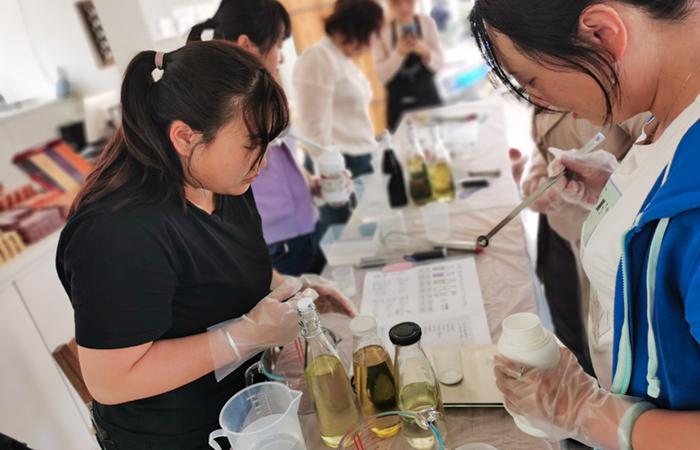 在專業(yè)芳香師的指導(dǎo)下,參加活動(dòng)的職工兩人一組、通力配合,在掌握精確的溫度和重量后,大家在量杯中有序地加入各種原料和自己喜歡的精油,通過持續(xù)攪拌,神奇的化學(xué)反應(yīng)給大家?guī)砹梭@喜,皂液倒入模具后呈現(xiàn)的各種形狀也讓人賞心悅目。