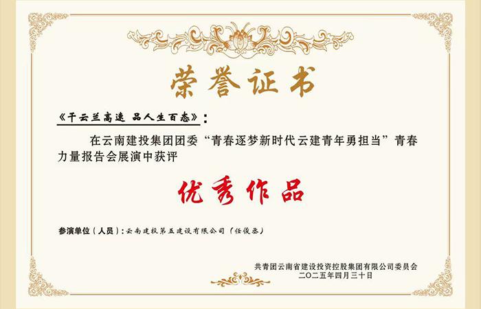 2025年五四青年節(jié),集團(tuán)舉辦“青春逐夢(mèng)新時(shí)代 云建青年勇?lián)?dāng)”青春力量報(bào)告會(huì)。展演中,由公司團(tuán)委、市政路橋四部聯(lián)合編創(chuàng)的脫口秀《干云蘭高速,品人生百態(tài)》作品獲評(píng)“優(yōu)秀作品”。